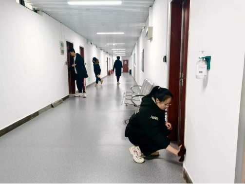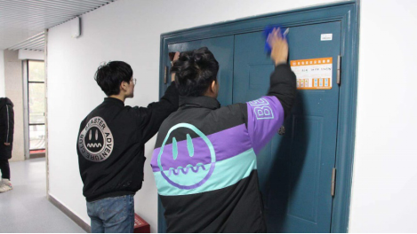 院楼内部,同学们拿着抹布和扫把对院楼的室内进行打扫,认真细致地清理院楼每一层每一个角落。同学们齐心合力,擦桌子、椅子,擦栏杆、门框,扫走廊、楼梯,为绿植浇水,让装修完成的院楼展现出它的风采。