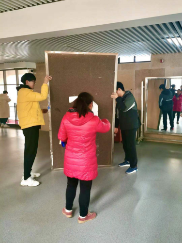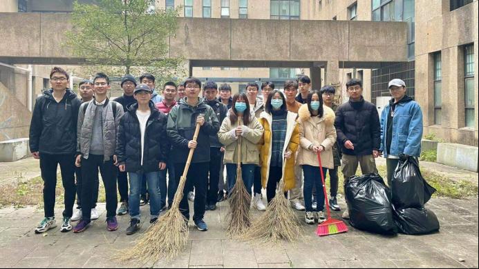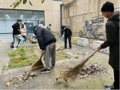 同学们不顾冬天的寒冷,热火朝天地开始打扫院楼一层的天井。男生们将楼道内的杂物搬到天井里摆放整齐,女生们清理天井地上的白色垃圾和枯叶。不到半个小时,楼道里的杂物都被整整齐齐地摆放在干干净净的天井里。同学们拿着清扫工具合影留念,脸上洋溢着劳动后幸福的笑容。
