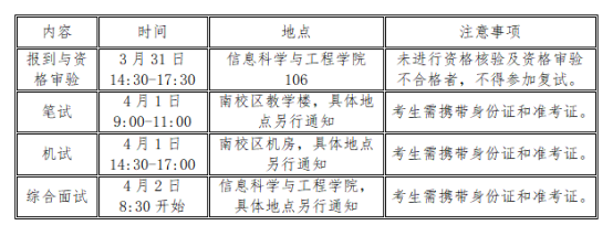 本次复试采用现场复试方式,考核形式为专业课笔试、机试和专业综合面试。复试成绩(满分240分)= 专业课笔试成绩 + 专业综合面试成绩,机试成绩不计入复试成绩。