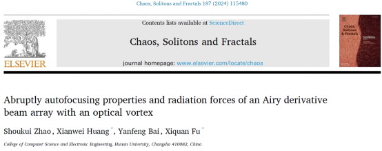 近日,Elsevier旗下权威期刊《Chaos, Solitons & Fractals》(SCI一区)在线发表了复杂环境量子信息感知及应用课题组在利用新型光束进行粒子操控研究方面的新成果,论文题为“Abruptly autofocusing properties and radiation forces of an Airy derivative beam array with an optical vortex”(Chaos, Solitons and Fractals, 187, 115480 (2024))。 九色