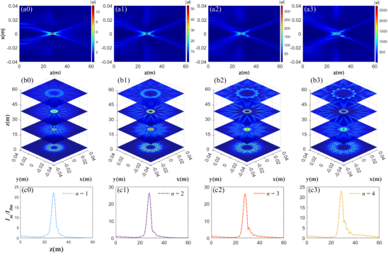 课题组在前期深入开展光量子传输与调控研究的基础上,针对上述粒子捕获应用中的激光调控问题,提出了一种具有涡旋结构的艾里导数光束阵列,在不施加其他光学系统的前提下,该光束具备突然自聚焦能力,且通过控制光源能实现可控的聚焦距离及强度。基于该光束独特的自动聚焦特性及涡旋开展了微小粒子捕获的研究,通过调控光源可灵活控制光束对微粒的作用力,此外还能够实现不同距离处的稳定粒子捕获,表明该光束具备在不同位置处同时捕获粒子的特性,这在光镊微粒操控方面具有重要应用前景。