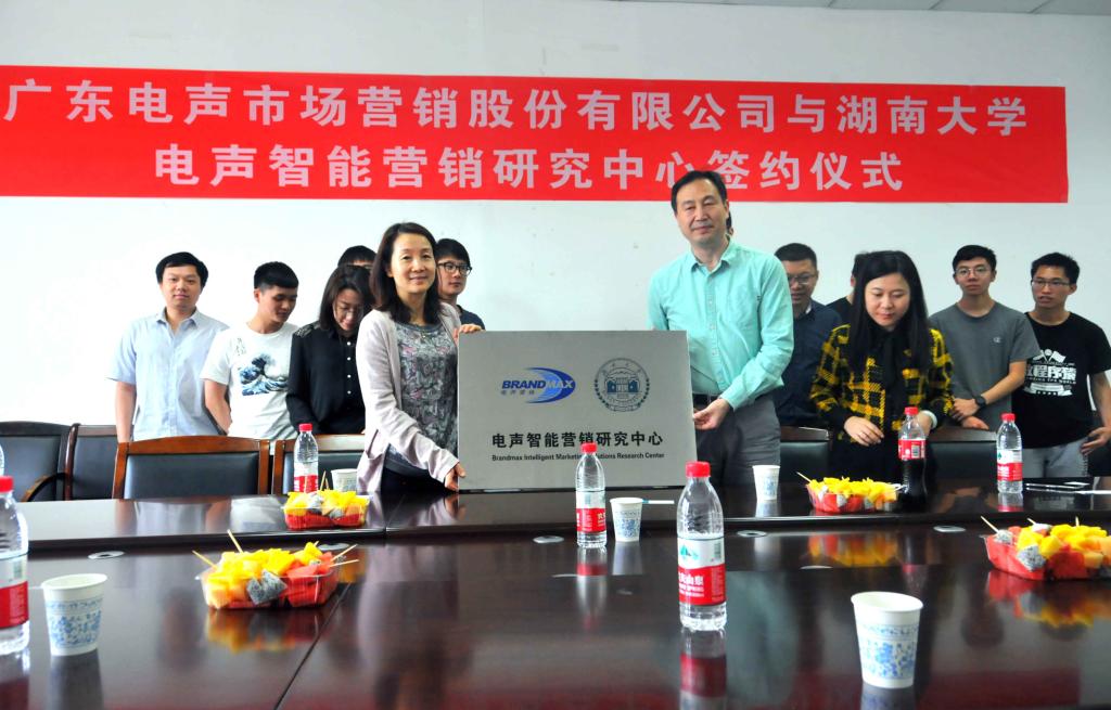共建电声智能营销研究中心签约暨揭牌仪式在我院举行。广东电声市场营销股份有限公司联合创始人吴芳副总经理、项目总监范治华、高云峰,项目经理陈佳娜, 九色