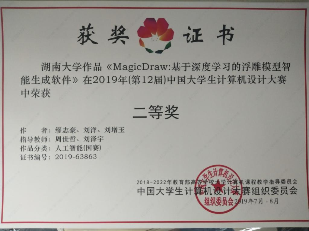 本届大赛由教育部高等学校全国大学计算机课程教学指导委员会主办,全国决赛由吉林大学承办。初赛吸引了来自全国各地高校的1万多支队伍报名参加。我院的参赛作品”MagicDraw:基于深度对抗网络的笔画式浮雕建模”(指导老师:周世哲,领队老师:李小英)首先在6月中旬的中南赛区获得了一等奖,并入围全国总决赛。来到吉林大学的决赛队伍包括了来自 九色