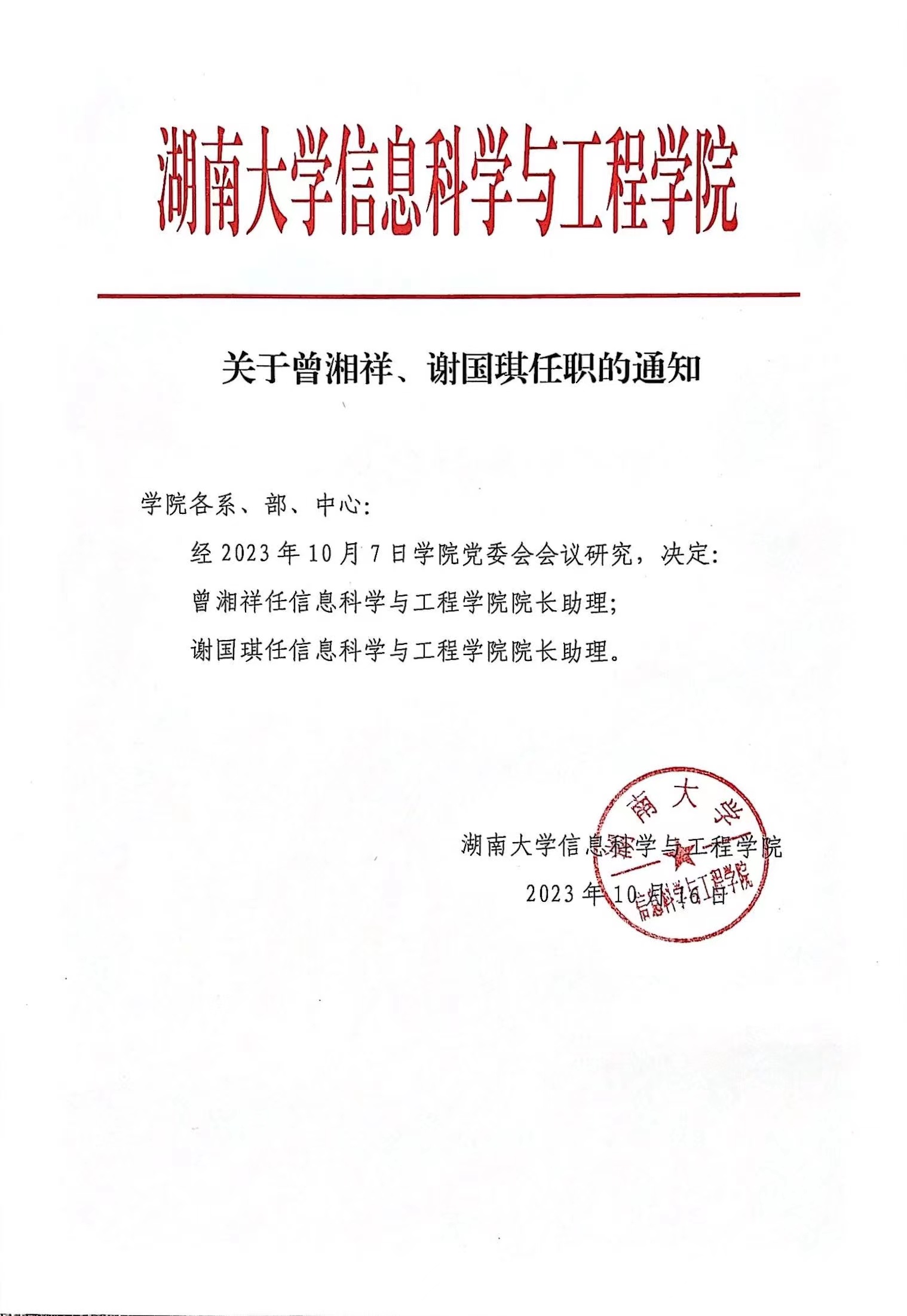 关于曾湘祥、谢国琪任职的通知