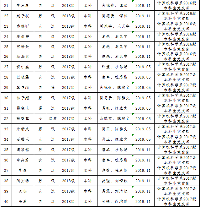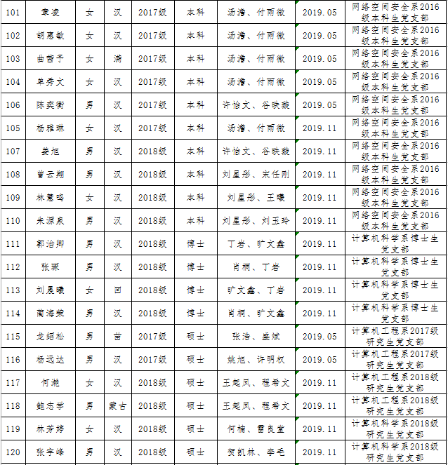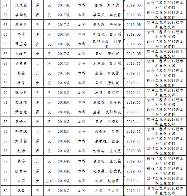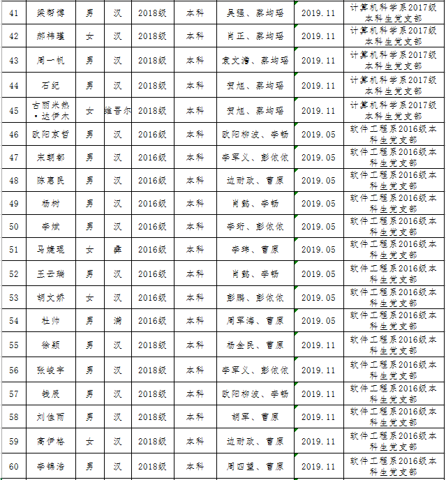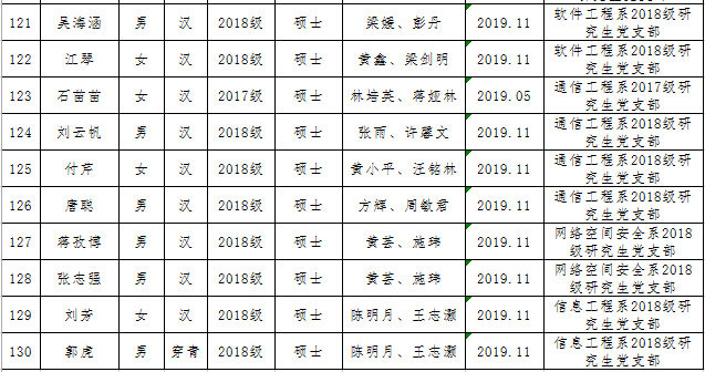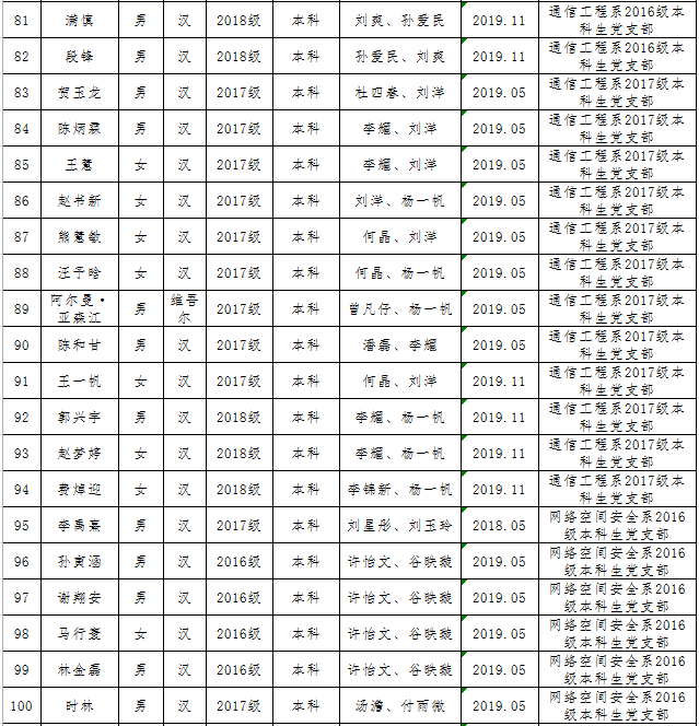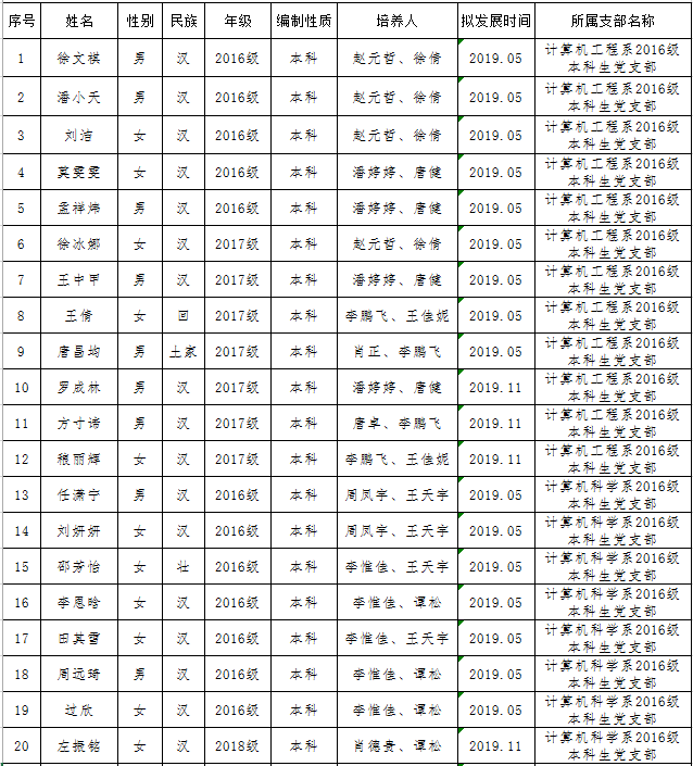 校党委2019年初划拨给我院的2019年发展党员计划控制数,我院2019年可发展学生党员130人。经学院党委充分讨论,将各年级、各专业计划控制数下拨至各党支部,由党支部充分酝酿、讨论和支部会议通过,确定发展对象人选。经党委会讨论,确定130名同志为2019年发展对象,纳入年度党员发展计划,现具体名单公示如下: