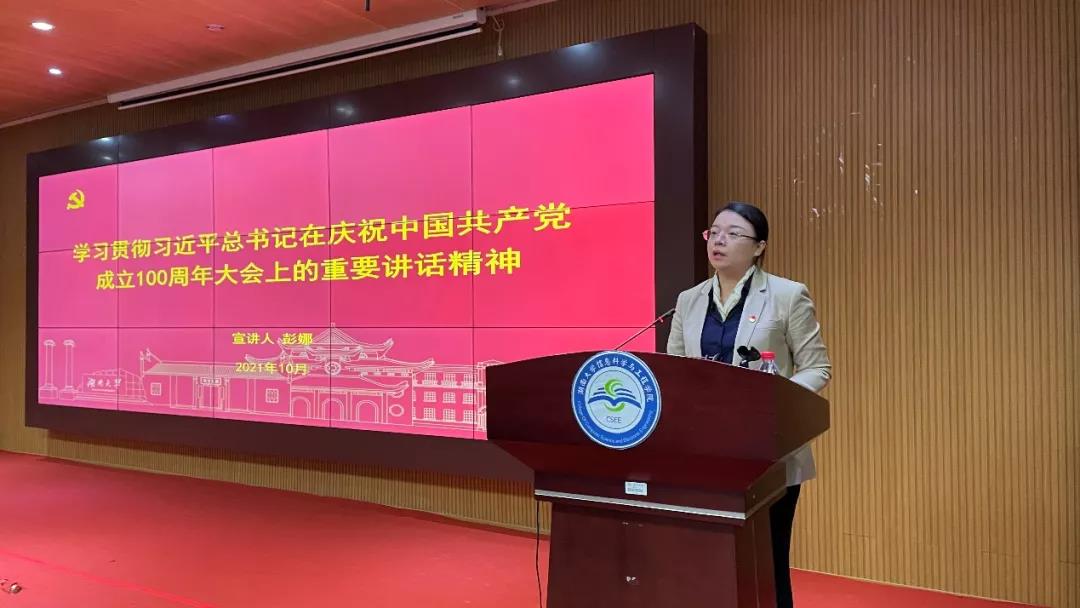 2021年10月24日,我院举行学习贯彻习近平总书记“七一”重要讲话精神宣讲报告会,重温习近平总书记在庆祝中国共产党成立100周年大会上的重要讲话,深入学习贯彻“七一“重要讲话精神,深刻领会和把握习近平总书记“七一”重要讲话的重大意义。宣讲会由学院党委副书记彭娜主讲,全体学生党支部书记、团支部书记参加会议。