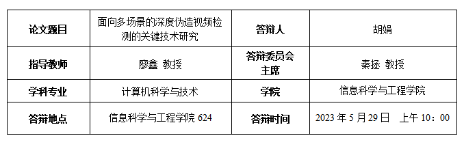 [3] 廖鑫,胡娟, 秦拯. 一种基于表征对比预测学习的深度伪造视频检测方法. 专利号:ZL202110482301.2,授权日期:2022.09.30. (授权, 本人第二发明人, 导师第一发明人)