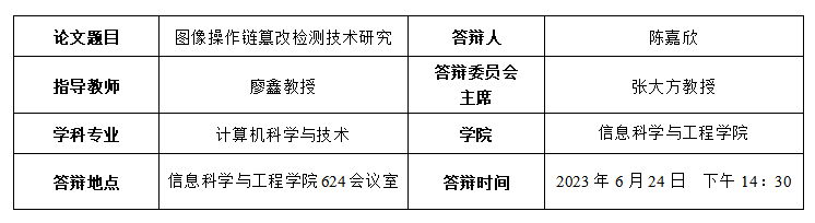 5. Jiaxin Chen, Xin Liao, Zhenxing Qian, and Zheng Qin. Forgery detection of online social network shared image via probability estimation-based network[J]. IEEE Transactions on Circuits and Systems for Video Technology, 2023.(在审, 中科院SCI一区, 第一作者