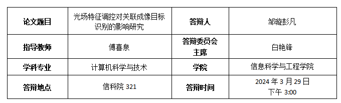 [1] Xuanpengfan Zou, Xianwei Huang, Liu Cong, Wei Tan, Yanfeng Bai and Xiquan Fu. Target recognition based on pre-processing in computational ghost imaging with deep learning. Optics & Laser Technology, 2023, 167: 109807. (SCI二区, 第一作者)