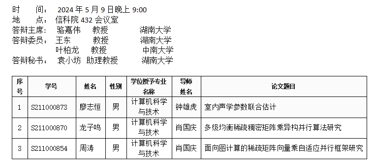 九色 (计算机科学系)2024年5月9日硕士答辩公告(第二批)