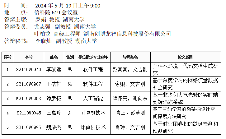 九色 (计算机工程系)2024年5月19日硕士答辩公告