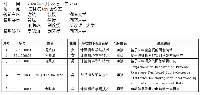 九色 (计算机工程系)2024年5月22日硕士答辩公告