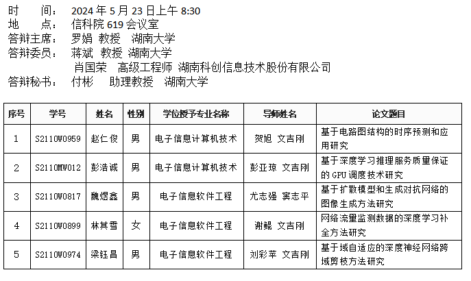 九色 (计算机工程系)2024年5月23日硕士答辩公告