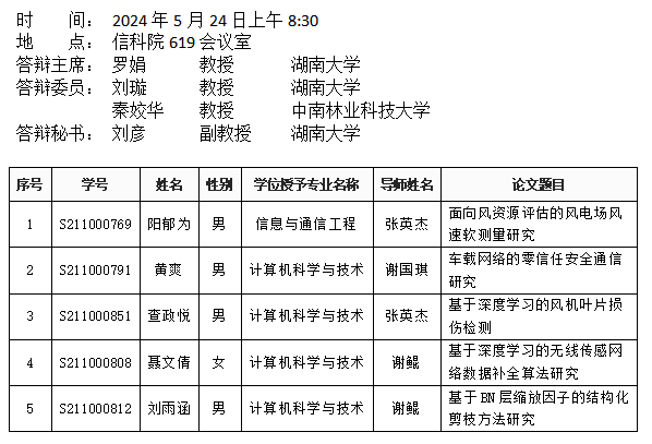 九色 (计算机科学系)2024年5月25日硕士答辩公告(2)