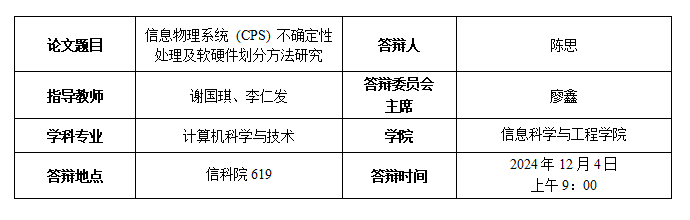 信息物理系统 (Cyber-Physical System, CPS) 存在不确定性,设计时需要妥善处理。目前,概率论和模糊理论广泛用于处理不确定性,但它们在建模置信度时可能产生违反直觉的结果。不确定理论于 2007 年被提出应对这一挑战,并已初步应用于 CPS 软硬件划分问题中,但当前缺乏系统性的框架来指导如何在软硬件划分中应用不确定理论。本论文聚焦于 CPS 不确定性,研究使用不确定理论求解 CPS 软硬件划分问题的方法,旨在提出一种涵盖不确定性处理方法的范式,并在该范式下重点研究可靠性和时间的表示方法,主要创新如下: