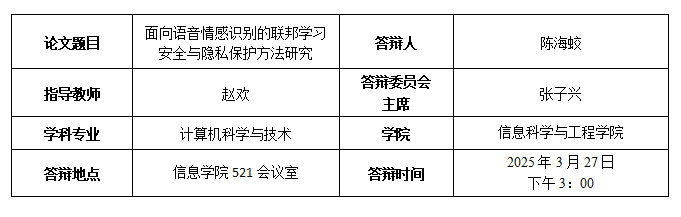 Haijiao Chen, Huan Zhao*, Yingxue Gao, Yiming Liu, Zixing Zhang*, “Parameter-efficient federal-tuning enhances privacy preserving for speech emotion recognition,” in Proc. IEEE International Conference on Acoustics, Speech and Signal Processing (ICASSP), 2025: 1-5. (EI,CCF-B类,第一作者)