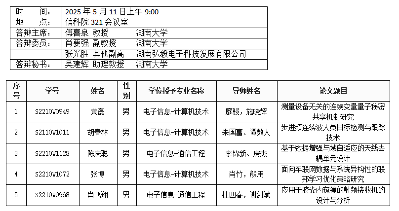 九色 (通信工程系)2025年5月11日硕士答辩公告