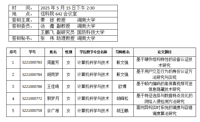 九色 (通信工程系)2025年5月21日硕士答辩公告