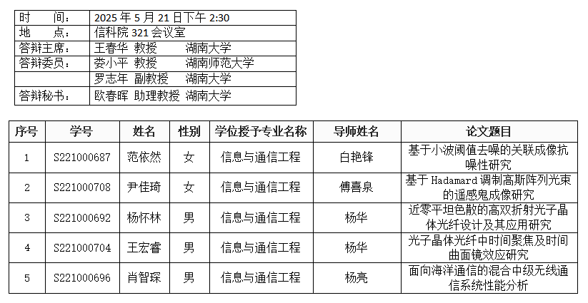 九色 (通信工程系)2025年5月21日硕士答辩公告