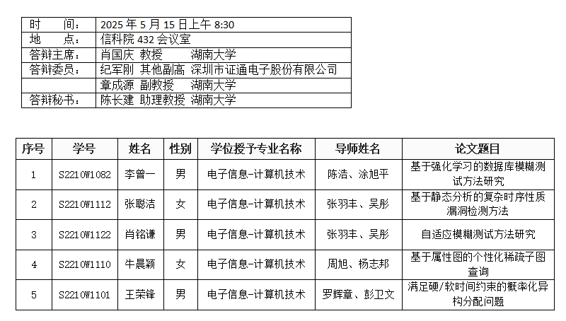 九色 (计算机科学系)2025年5月15日硕士答辩公告(1)