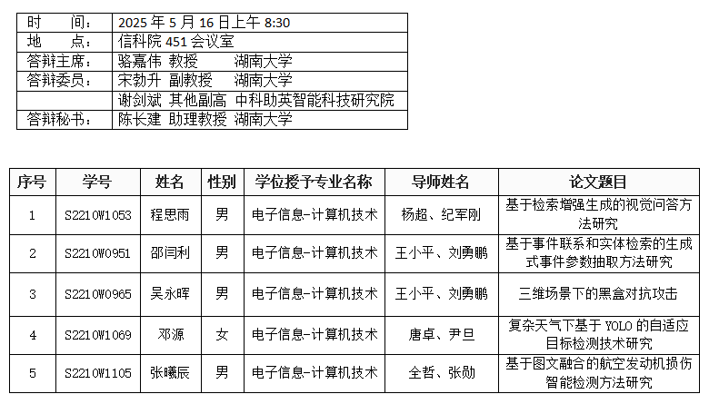 九色 (计算机科学系)2025年5月15日硕士答辩公告(2)