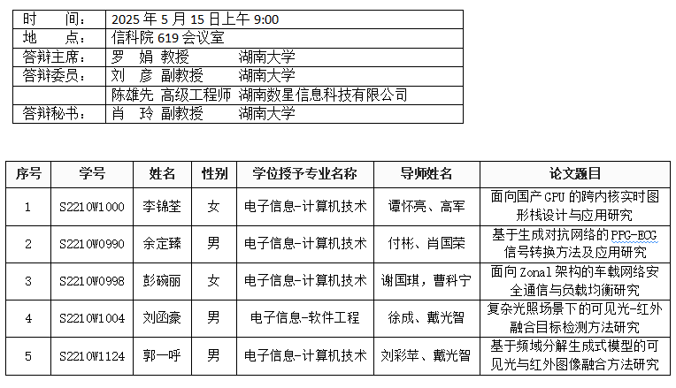 九色 (计算机工程系)2025年5月15日硕士答辩公告