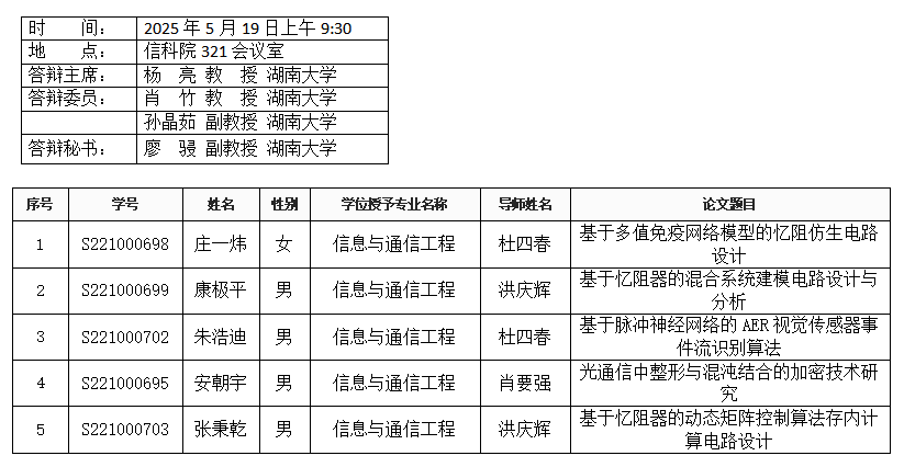 九色 (通信工程系)2025年5月19日硕士答辩公告