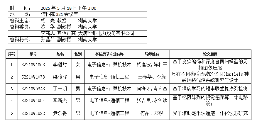 九色 (通信工程系)2025年5月18日硕士答辩公告