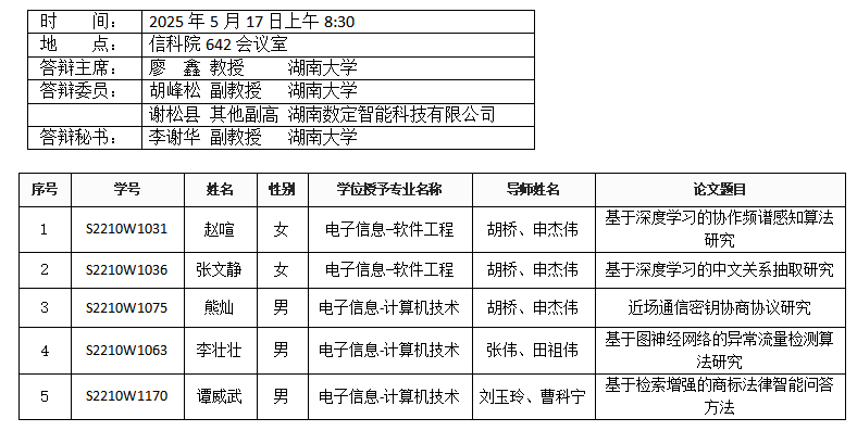 九色 (计算机科学系)2025年5月17日硕士答辩公告(2)