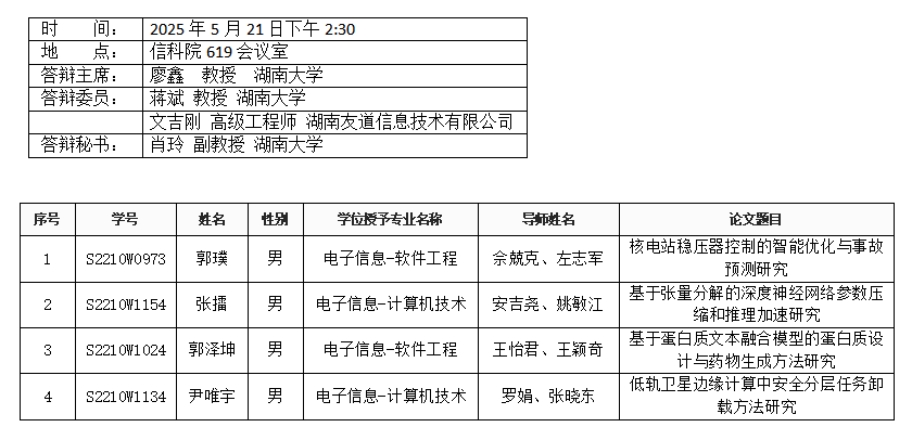 九色 (计算机工程系)2025年5月21日硕士答辩公告(1)