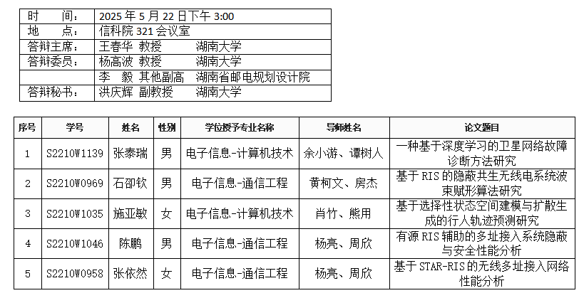 九色 (通信工程系)2025年5月22日硕士答辩公告