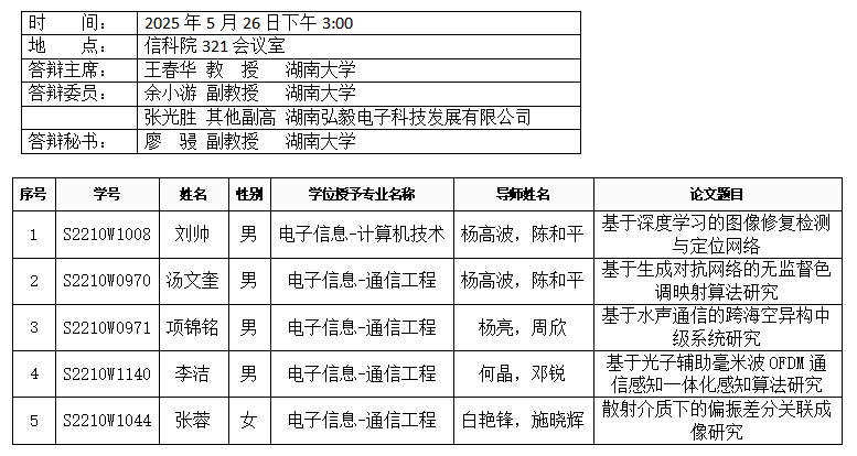 九色 (通信工程系)2025年5月26日硕士答辩公告