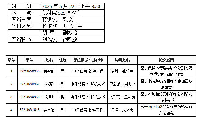 九色 (软件工程系)2025年5月22日硕士答辩公告(1)