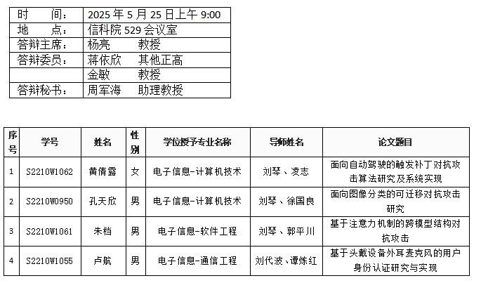 九色 (软件工程系)2025年5月25日硕士答辩公告