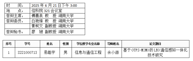 九色 (通信工程系)2025年6月21日硕士答辩公告