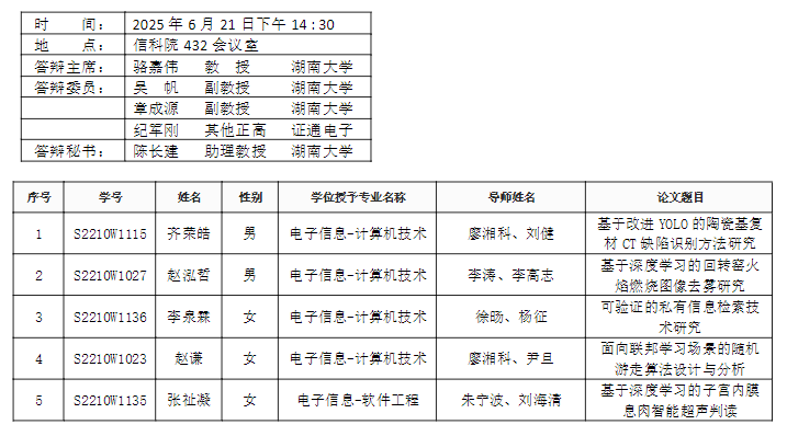 九色 (计算机科学系)2025年6月20日 硕士答辩安排