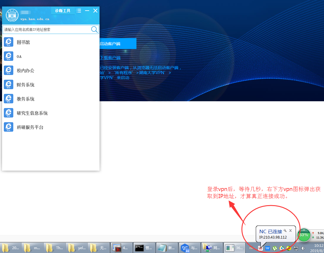 登录vpn后,等待几秒右下方图标弹出获到IP地址,才算真正登录成功。